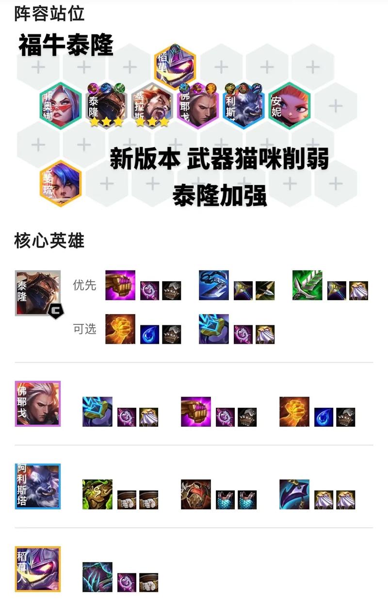 〖Six〗、《金铲铲之战》s8上分阵容宗师玉剑泰隆玩法思路分享阵容组成 泰隆、慎、莫甘娜、永恩、基兰、艾瑞莉娅、派克、迦娜 阵容站位 泰隆跳对面c位置,永恩站对面肉的后面破抗性。装备推荐 优先无尽饮血做泰隆装备。