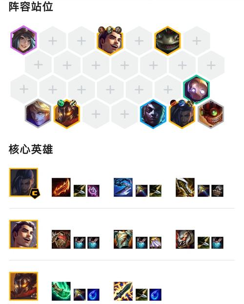 〖Four〗、金铲铲之战炼金科技这套阵容的核心英雄包括蒙多、维克托、丽桑卓、扎克和沃里克。装备分配上,卡莎的羊刀和法爆是必须的,蒙多则需要狂徒铠甲、巨龙之牙和荆刺背心,维克托则需要巨龙之牙和青龙刀,丽桑卓则只需鬼书。