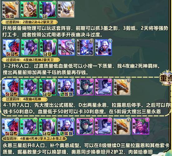 〖Four〗、中期,你需要在6人口时大搜一波,找到永恩和其他关键英雄,然后尽快凑齐羁绊,开始锁血连胜。后期,你则需要根据对手的阵容和强度来调整你的站位和装备,确保永恩能够安全输出,带领你的队伍走向胜利。总的来说,金铲铲之战S7幻境永恩的玩法就是这样。