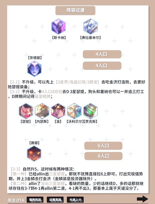 六人口能上璐璐最佳凑出三驯龙,当然来的越早越好,六人口如果还没有蛙需要小d养太晚中期强度不够。4-1上七人口,可以把石傲玉搜出来、有了石傲玉以后就上人口,当然此时有赛芬,咱们就果断玩之前耳朵出到过的幽影龙赛芬蛙咯!5-1上八人口,阵容成型。全员两星以后上九人口。