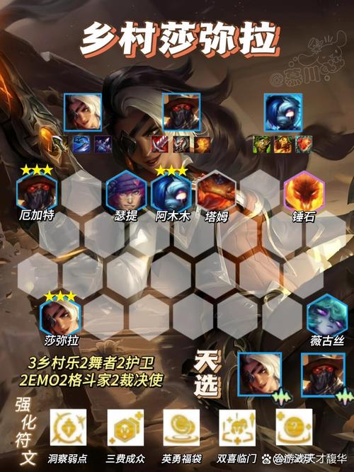 〖Two〗、- 莎弥拉和刀妹三星后上6人口,补上瑟提即阵容成型。此时强度高,可轻松减少对手血量。- 如果之前找一费卡花费过多,建议拉上限找卡莎剑姬。有挑战转职可给烬装备。- 顺利可在6级D出两星三星,长时间找一费卡三星建议上7开始D。- 3-4选秀:拿阵容卡,然后考虑装备。