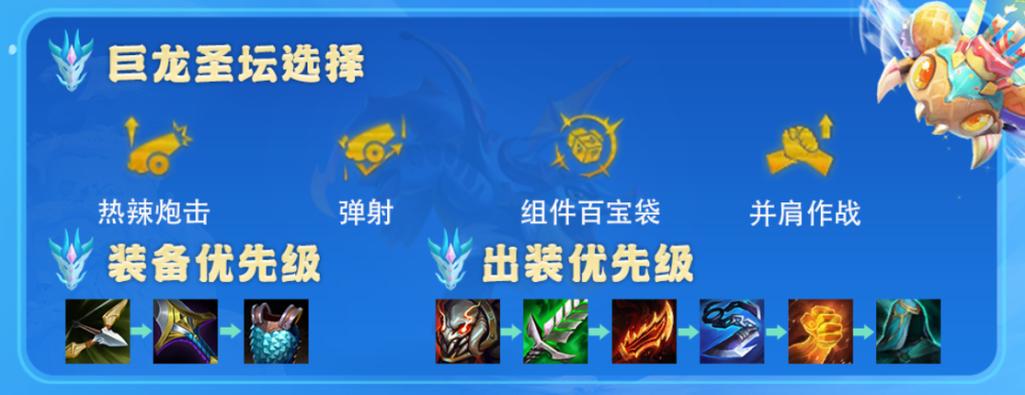 〖One〗、- 主C逆鳞战姬(龙女):分裂之刃、正义之手,第三件装备推荐水银,若无水银,对抗寒冰射手时较为困难。- 主坦狻猊之心(纳尔):推荐装备包括反甲、龙牙、狂徒铠甲,狂徒铠甲可替换为复活甲。- 皮城执法官(蔚):捡取法系装备,其大招有可能实现连续控制,秒杀敌方后排。