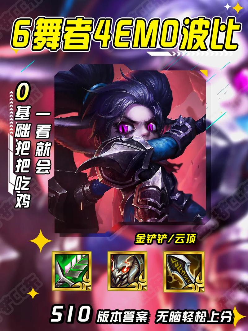 〖Two〗、- 波比(主C):饮血剑、泰坦、无尽之刃。- 阿木木(主T):狂徒、反甲、日炎斗篷等坦克装备。- 薇古丝(副C):法术强度相关的输出装备。 符文选取:- 情感连接、屈服于深澜、巨人之握、吸血习性。以上便是金铲铲之战S10版EMO舞者波比阵容的全面攻略。玩家可根据这些信息在游戏中搭建阵容。