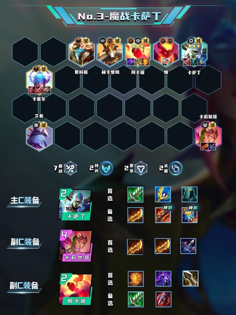 暗影刺客阵容 以暗影和刺客的组合,这个阵容强调潜行和快速切入,秒杀对方关键单位。核心英雄 艾克整个刺客阵容的核心,艾克的秒表技能可以在关键时刻扭转战局。凯隐拥有强大穿透能力的凯隐,能在战斗一开始就给对手带去巨大压力。莫甘娜作为暗影的一员,莫甘娜的大招能在团战中发挥巨大作用。