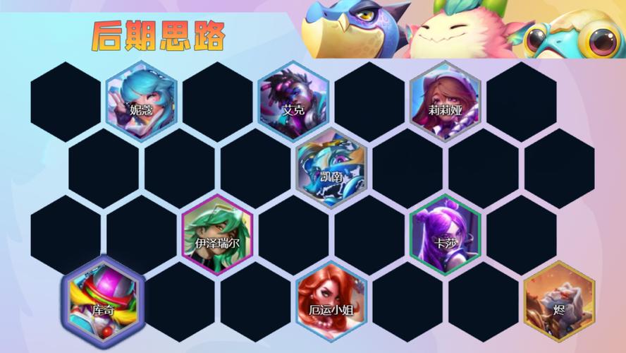 第一个海克斯拿到好事成双即刻展开战术。早期获取米利欧,利用以绪塔尔前排的格子给妮蔻,后排的风火雷等奶妈角色可由奶妈青龙刀吸收。稳健过渡,减少不必要的血量损失。- 中期运营 2-1升4人口,优先组成阵容所需的角色。2-4选秀阶段,优先寻找妮蔻的科技枪,随后是合适的泰坦等装备小件。