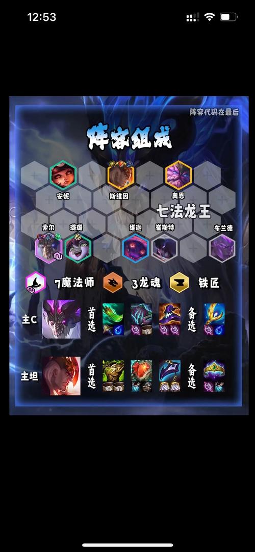 阵容构成包括:泰隆、塞拉斯、安妮、菲欧娜、阿利斯塔、佛耶戈、厄斐琉斯、费德提克。核心羁绊为3混沌、6福牛、1怪兽、1堕落使者、1枪神。福牛纹章是首选转职,其次考虑混沌纹章。英雄强化方面,泰隆和佛耶戈为最佳选取,安妮的团队强化也不错。