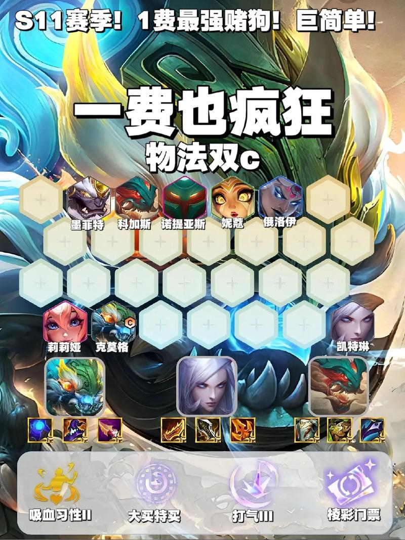 〖Two〗、阵容一:拼多多小法阵容,主要英雄包括战争之影-赫里卡姆、魂锁典狱长-锤石、魔蛇之拥-卡西奥佩娅、仙灵女巫-璐璐、邪恶小法师-维迦、唤潮鲛姬-娜美、风暴之怒-迦娜。核心英雄维迦的装备推荐为:蓝BUFF(泪滴+泪滴)、科技枪(大剑+大棒)、正义之手(拳套+泪滴)。