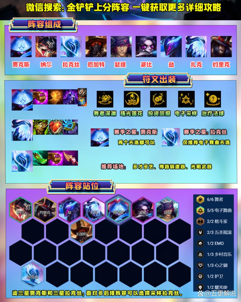 〖One〗、七法火男、明昼战神劫和七法小法。对于赌狗玩家,1费卡的热门阵容是重点。运营玩家可以关注明昼天使、森林龙王霞、山海重秘和9腥红阵容。最后,小嗨为大家准备了S5版本的装备合成图、抽卡概率图和阵容图,想要获取高清版本的朋友可以在后台回复1获取。