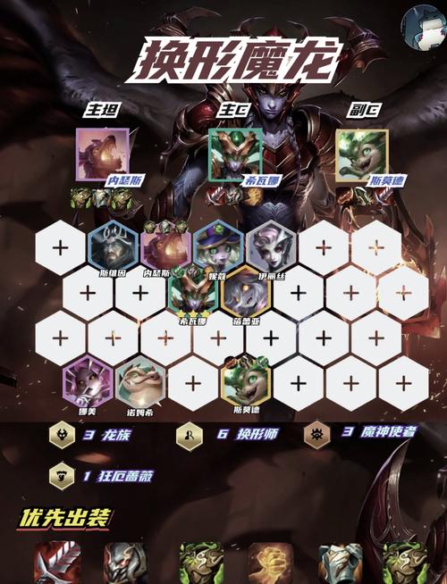 〖One〗、阵容一:豹女换形 豹女、纳尔、蜘蛛、乌鸦、妮蔻、希瓦娜、索拉卡构成阵容。若装备玉龙之心或玉龙纹章,可尝试6玉龙4变形师或继续6变形师。若索拉卡未出现,可补充怒翼龙,龙女亦能作为后期副C,实力强劲。豹女关键装备包括水银、羊刀,前者解控,后者加速输出。