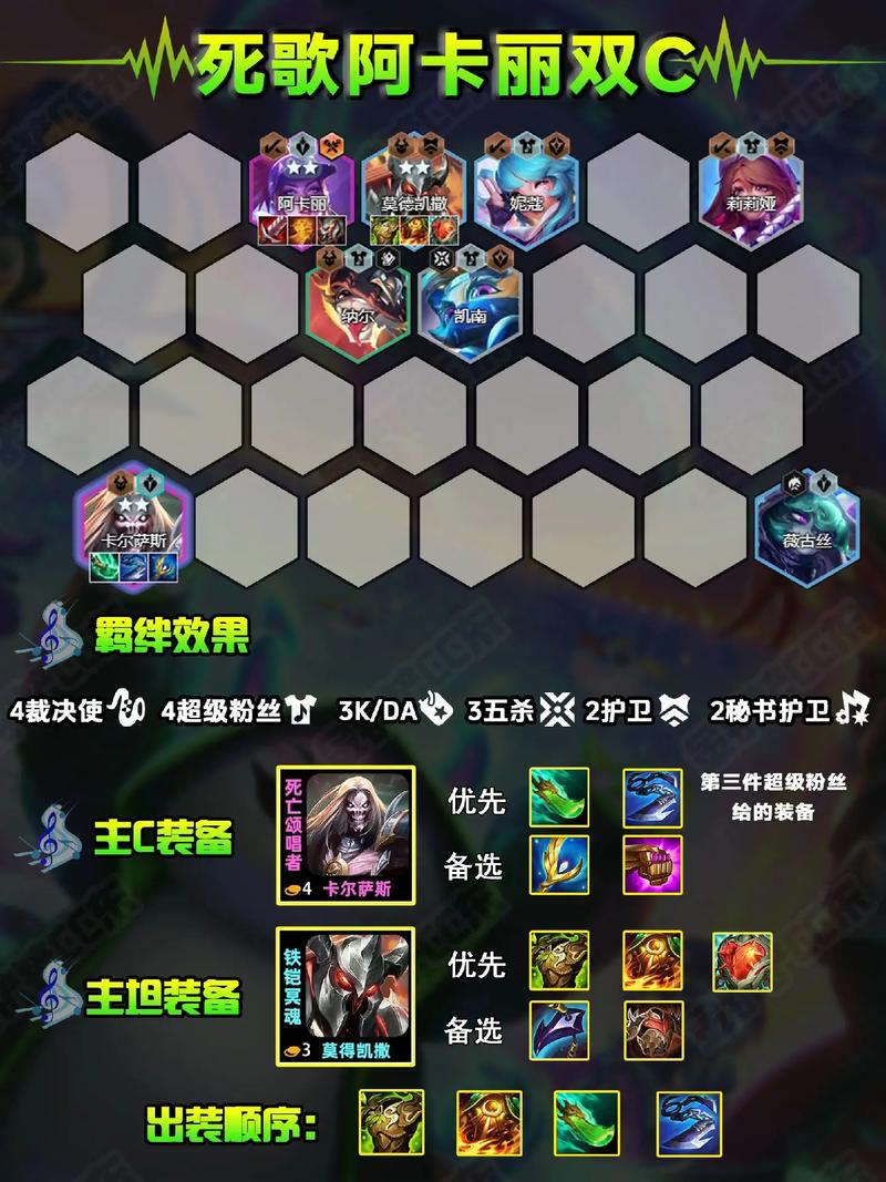 增加暴击伤害。 - 如果阿卡丽KDA天选,即可选取开KDA,选取合适的站位。 - 如果死歌五杀摇滚天选,即可开高五杀增加死歌伤害。- 后期:裁决双C阵容对装备的需求很高,八人口才能出四费天选,成型后即可上高人口找高费卡补整体质量。按照以上步骤运营,即可在金铲铲之战S10赛季中玩转裁决双C玩法。