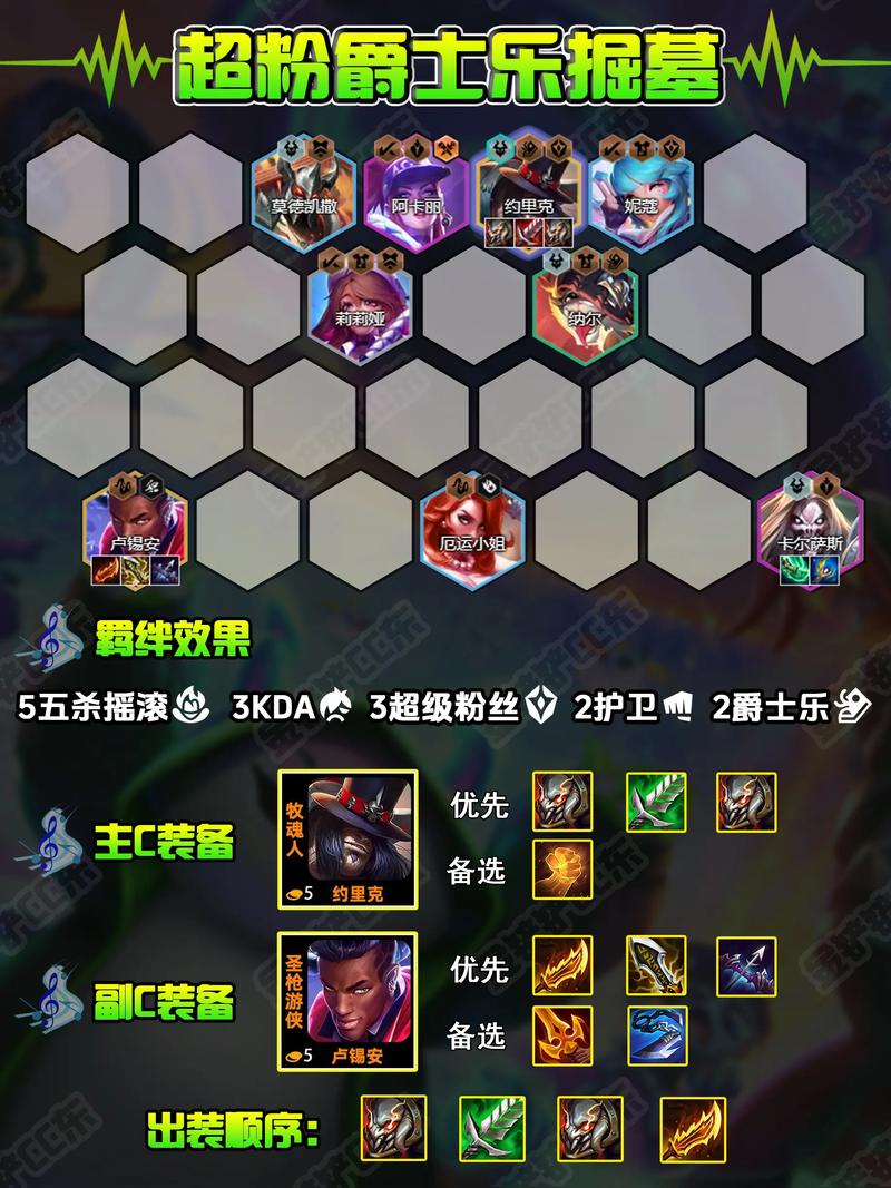 〖Two〗、金铲铲之战s10五杀纳尔阵容玩法如下: 阵容构成:- 该阵容以纳尔为主C,搭配五杀摇滚、超级粉丝、舞者、KDA和裁决等羁绊。- 关键羁绊为5/7五杀摇滚(提供伤害减免和额外伤害加成,击杀敌方弈子后提升友方伤害和攻速)、3超级粉丝(为赛季之星纳尔提供一件成装)以及其他辅助羁绊。