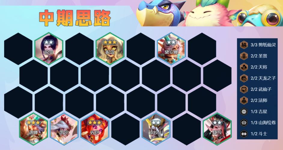 〖Three〗、金铲铲之战上分阵容推荐——驯龙赛芬组合:核心棋子:黑默丁格、崔丝塔娜、璐璐、塞拉斯、赛芬、佐伊、巴德和索拉卡。羁绊搭配:3驯龙大师、1龙神、1窃法巧手、1唤星者、4幽影龙、2格斗家和2魔导师/3法师,形成强大的协同效应。