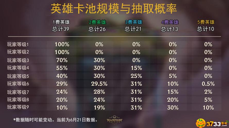玩家2级时:1级棋子抽取概率为100%。玩家3级时的各阶掉率:1级棋子抽取概率为70%、2级棋子抽取概率为25%、3级棋子抽取概率为5%。玩家4级时的各阶掉率:1级棋子抽取概率为50%、2级棋子抽取概率为35%、3级棋子抽取概率为15%。