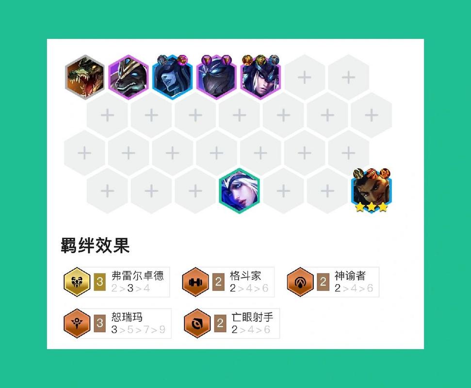 〖One〗、冰沙亡眼阵容:这是厄斐琉斯的一个核心阵容,主要依赖亡眼射手的羁绊来提升厄斐琉斯的输出能力。同时,你可以搭配其他合适的英雄和装备来增强阵容的整体实力。大成九五阵容:当游戏进入后期,你可以考虑转型为大成九五阵容,即包含多个五费英雄的阵容。