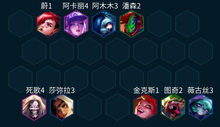 〖Three〗、一:阵容组成 阿木木、潘森、老鼠、薇古丝、阿卡丽/死歌/莎弥拉。二:羁绊组成 4裁决使、2朋克、2护卫、2EMO。三:装备推荐 老鼠: 红buff、无尽、正义。薇古丝: 青龙刀、法爆(帽子更好)、科技枪。阿木木: 板甲、龙牙、心之钢(肉装即可)。四:海克斯推荐 双喜临门、常客优惠。