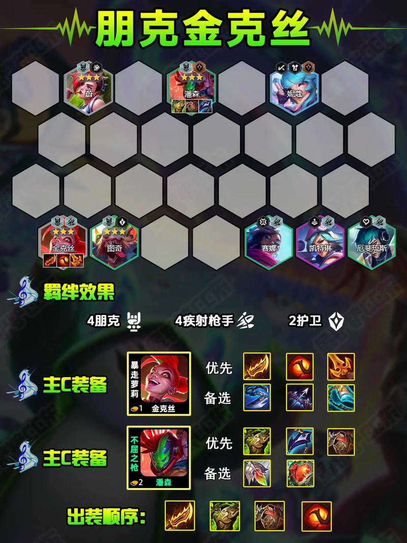 阵容推荐 成员:金克丝、潘森、锤石、厄斐琉斯、蔚、妮蔻、阿木木。羁绊:4朋克、4护卫、2疾射枪手。这样的羁绊组合能够大幅提升阵容的整体战斗能力。装备分析 抢装顺序:根据阵容需要,优先抢夺适合金克丝和前排英雄的装备,如轻语等。