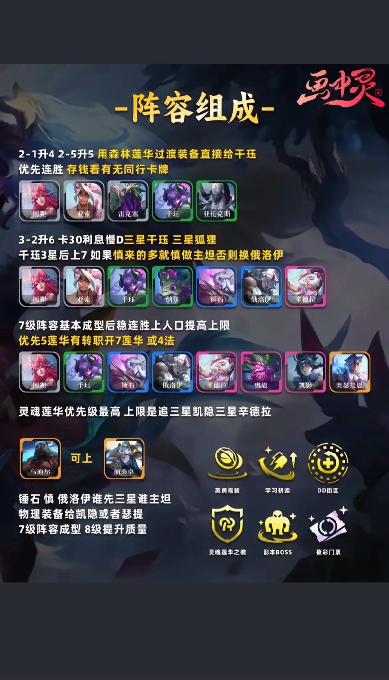 〖Four〗、运营策略: 前期过渡:在游戏初期,可以选取决斗等强势羁绊进行过渡,同时保持连胜以积累经济。 快速升级与搜牌:在前期稳定血量后,应快速拉到7或8人口,以增加找到关键英雄的概率。根据连胜或连败情况,在合适的时机进行选秀和搜牌。