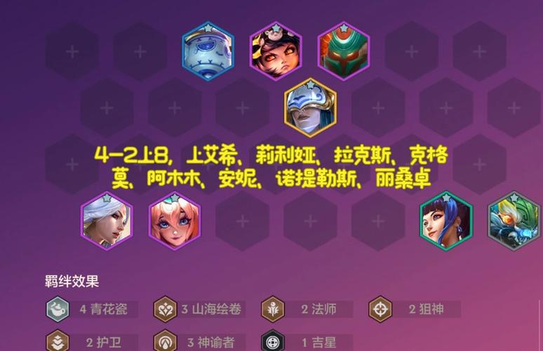 阵容组成:拉克丝、阿木木、大嘴、艾希、安妮、莉莉娅、泰坦、丽桑卓、阿兹尔,阵容羁绊:4神谕者4青花瓷3山海2护卫2法师2狙神,转职优先级:青花瓷纹章。