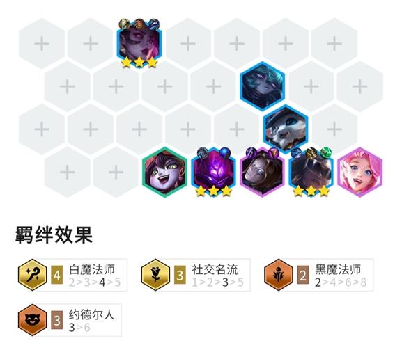 阵容:赛娜,莫甘娜,纳尔,塞勒芬妮,发条,璐璐,希尔科,构建一个4白魔3社交名流1微光首脑的阵容。 海克斯推荐:优先选取双重麻烦2,三费之力2,后排之迅2,以增强队伍的战斗力。