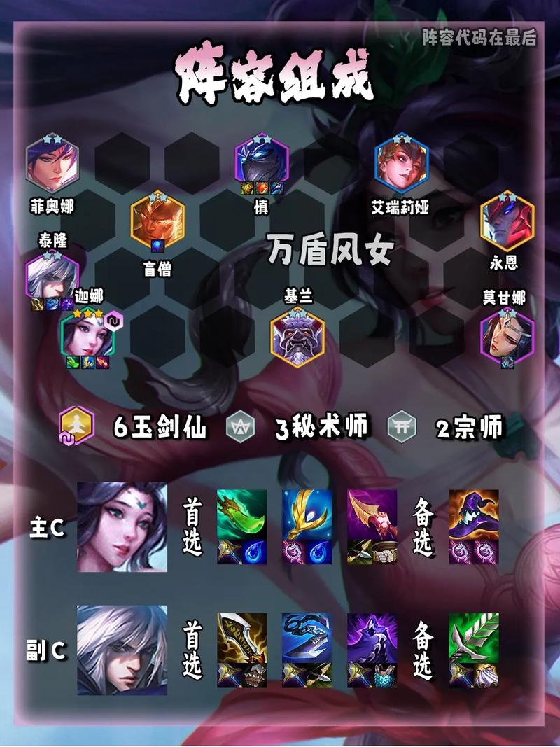 〖Three〗、组成阵容:永恩、剑姬、发条、风女、塔里克、拉克丝、猫咪、布隆、蕾欧娜。这套阵容里的每一张卡牌都是版本强势英雄,可以组成4战斗学院3白魔法师2挑战者的羁绊,既有强力的输出能力,也有很强的防守能力。