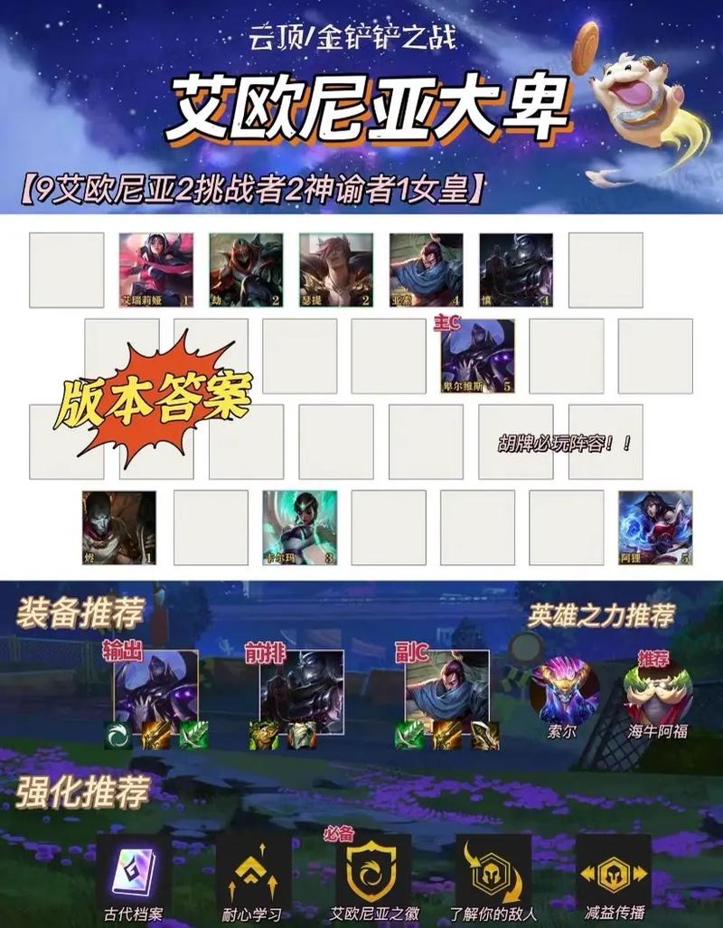 阵容组成:艾希、丽桑卓、阿克尚等。核心装备:阿克尚:无尽之刃+锐利之刃+破防者。运营思路:以阿克尚为核心输出,配合厄加特和瑟庄妮等前排坦克,提升整体输出和坦度。堡暗卡莉斯塔阵容:阵容组成:茂凯、索拉卡、塔里克等。核心装备:卡莉斯塔需要双羊刀。