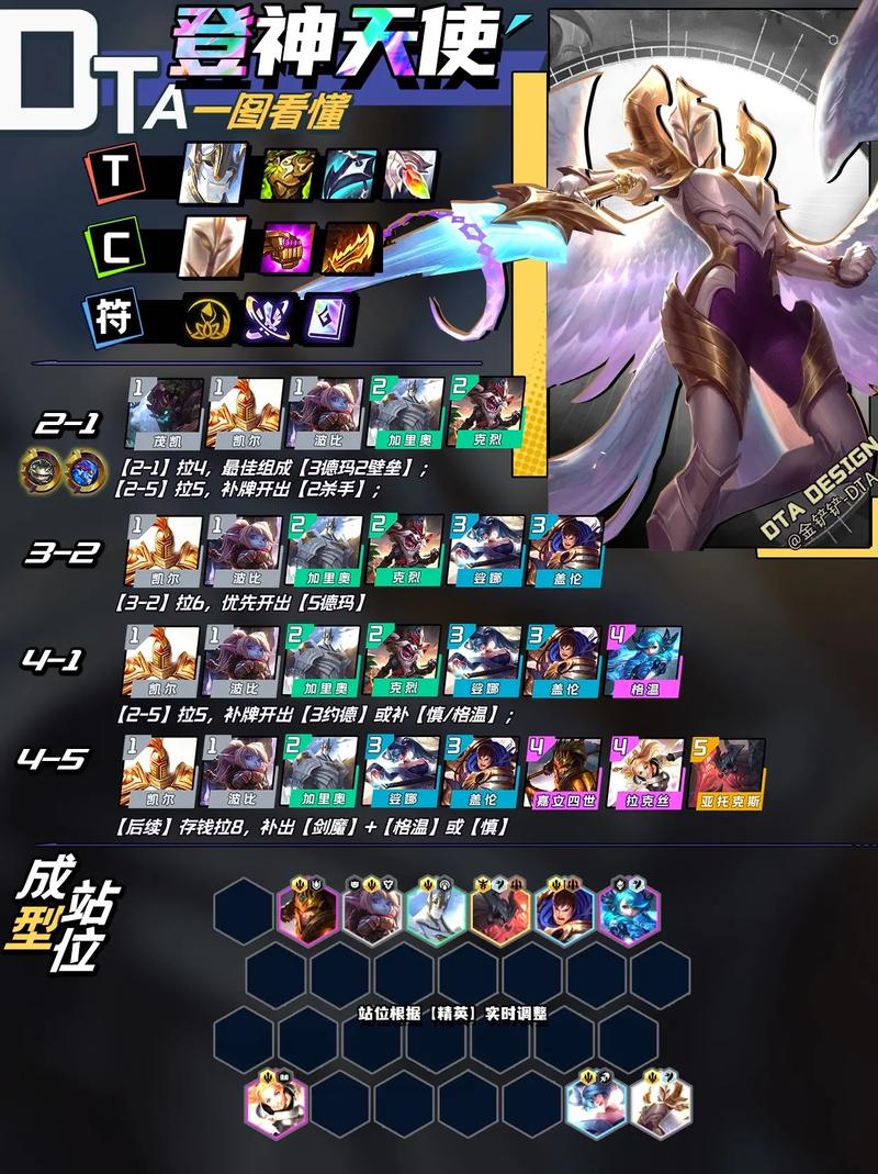 金铲铲之战中的登神天使阵容不亚于英雄黎明版的赌狗克烈阵容,那么金铲之战主天使C的阵容有什么推荐?强天使阵容有什么推荐?下面小编给大家介绍一下。天使作为一个昂贵的五费卡,有两个羁绊,分别是圣光守护者和征服者。攻击主要分为三个阶段。