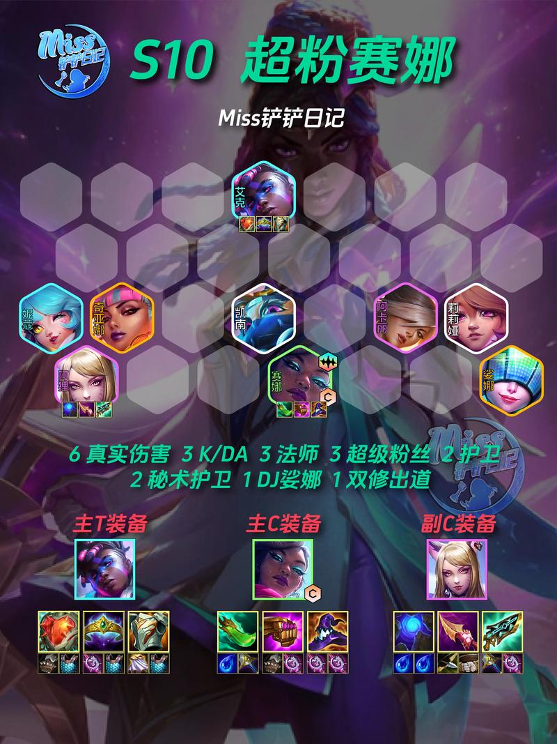 〖Three〗、【保镖白魔狙神】阵容组成棋子:赛娜、艾希、莫甘娜、蕾欧娜、布隆、璐璐、烬、发条阵容解析:这套阵容的组成比较灵活,主要是依靠狙神和白魔法师组成阵容,在游戏中,可以根据海克斯强化和转职装备,进行灵活的调整,比如4/5白魔法师,或2/4狙神等。