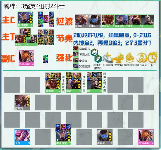〖Three〗、金铲铲之战福星最强阵容推荐包括塔姆、卡特、蔚、诺手、猪妹、安妮等英雄的组合。这个阵容结合了前排坦度和后排刺客,能够在战斗中灵活应对各种情况。此外,还有其他几个值得推荐的阵容,如福星九五阵容,由德莱文、瑟庄妮、瑟提等英雄组成,以五费卡为核心,拥有强大的单体输出和团控能力。