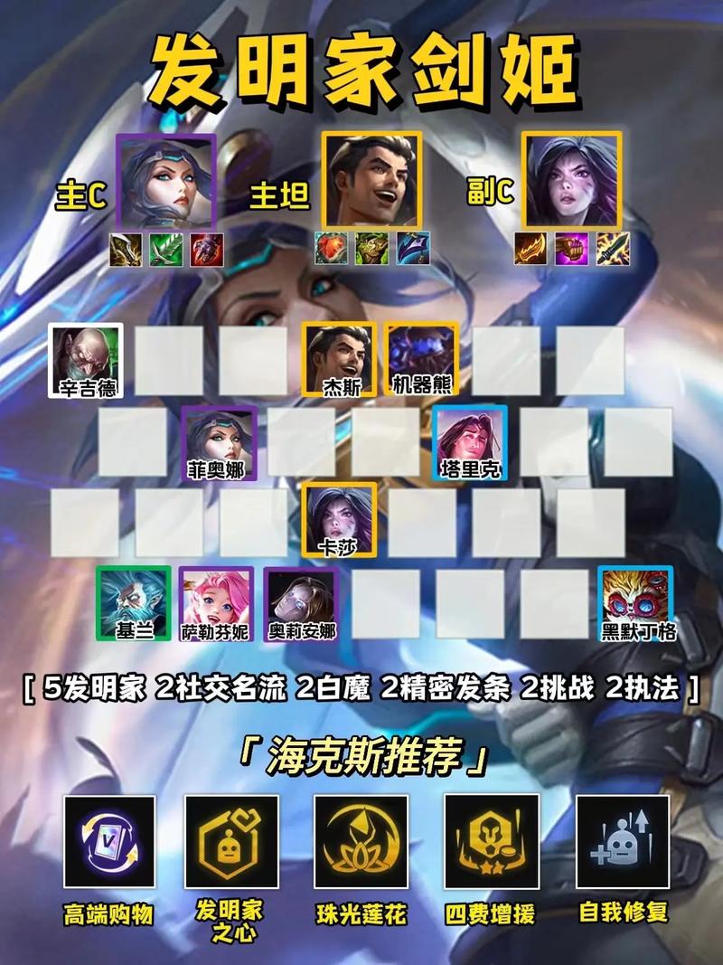 〖Three〗、金铲铲之战上分阵容推荐,我们关注的是推土车赛芬,这阵容比驯龙法更稳定。核心输出赛芬装备优先:火炮、科技枪、泰坦的决心。开局过渡建议使用3玉龙、2护卫、快射手,这些低费卡容易获取,如塔里克、锤石、卡尔玛、艾希、伊泽瑞尔。
