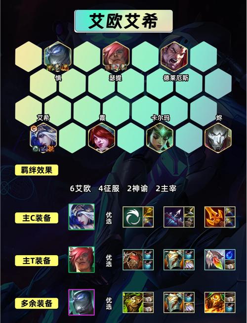 护卫艾希阵容:羁绊组成:6护卫、3灵魂莲华、2狙神。这个阵容以艾希为主C,前排护卫肉盾坚实,后排艾希和辛德拉提供稳定输出。玩法要点:前期利用护卫羁绊的坦度和羊刀、科技枪等装备,让艾希在后排稳定输出。注意前排肉装的积累,以确保前排能抗住伤害。
