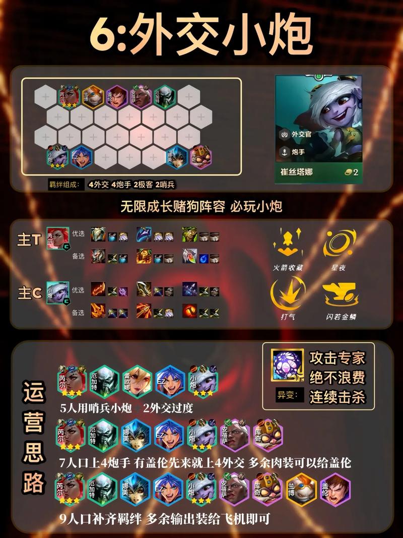 〖Four〗、赌狗艾希阵容包括:艾希、布里茨、雷克顿、卡蜜尔、亚索、伊泽瑞尔、薇恩、卡莎,羁绊为4情报特工、3源计划:激光特工、2AI程序、2决斗、2斗士。黑客劫 黑客劫阵容有亚索、艾克、赫卡里姆、瑟庄妮、蔚、劫、薇恩、尼菈、佐伊,羁绊包括4决斗大师、3源计划、2斗士、2秘术卫士、2黑客、2淘气包。