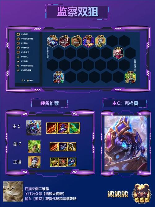 狙神阵容搭配方法 羁绊体系,1未来守护者、6狙神、2执法官、2保镖。云顶之弈狙神阵容装备选取,布隆:反甲、龙牙、狂徒,女枪:青龙刀、蓝buff、法爆,烬:无尽、轻语、巨杀。