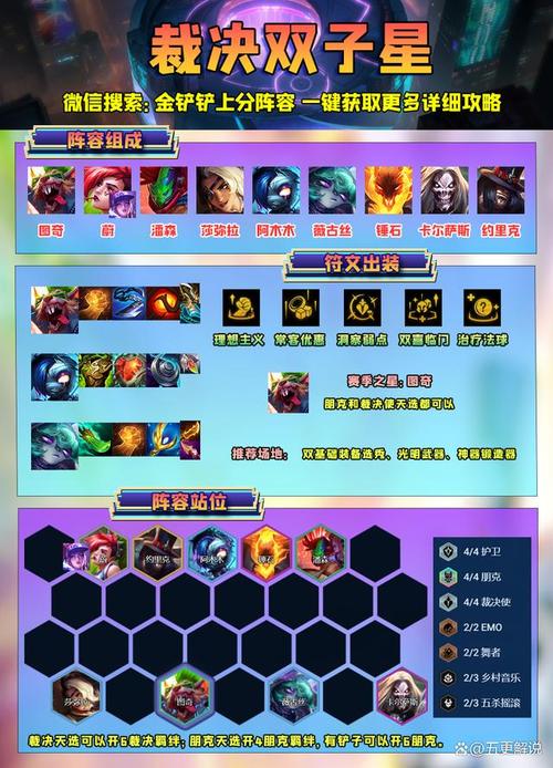 〖Four〗、阵容搭配一:哨兵狙神流核心棋子:麦迪、泽丽、辛吉德阵容羁绊:凑齐6哨兵+2执法官+2狙神,让麦迪和泽丽在后排疯狂输出。出装推荐:麦迪:攻速装备如电刀、羊刀,提升输出频率。泽丽:物理输出装如无尽、轻语,增强爆发力。辛吉德/艾瑞莉娅:肉装如狂徒、板甲,确保前排坦度。