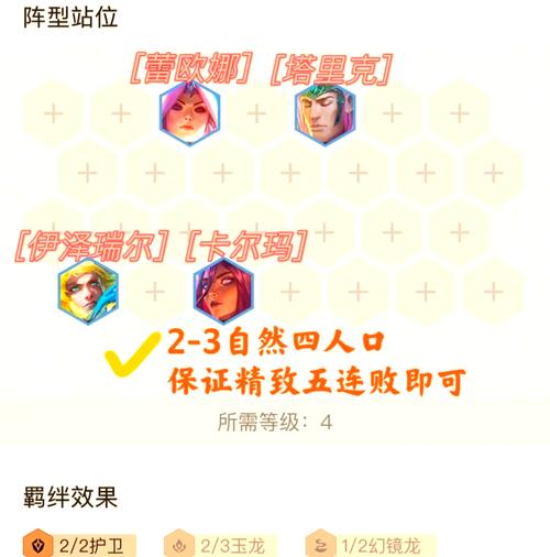 〖Four〗、阵容羁绊:4强袭炮手、1吟游诗人、4护卫、2怒翼龙、2秘术师、1冒险家。赛娜装备:鬼索的狂暴之刃、最后的轻语、巨人捕手/无尽之刃/正义之手。蕾欧娜装备:石像鬼石板甲、狂徒铠甲、巨龙之爪/荆棘之甲。站位推荐:简单运营指南: 开局反曲弓、大棒,前期三星界龙连败,利用经济利息。