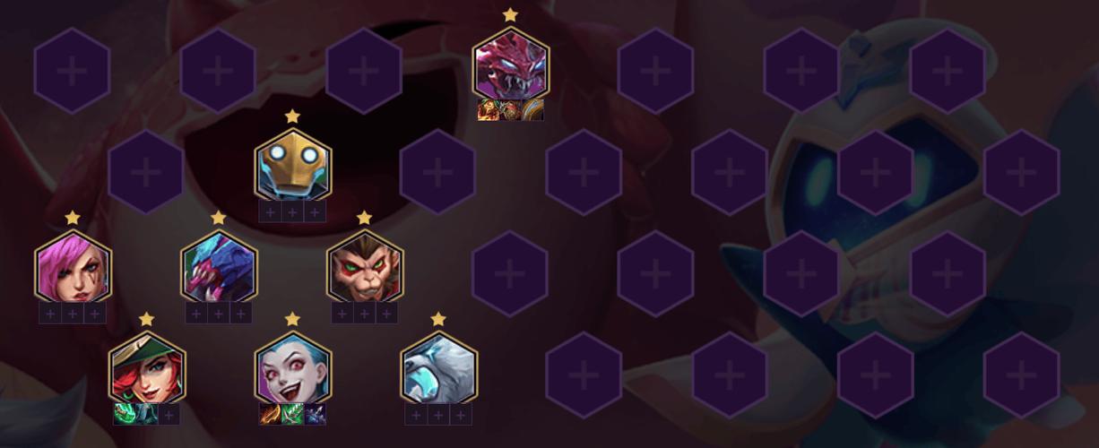 一种常用的8人口T0阵容包括机器人、3星虚空重炮(大嘴)、虚空恐惧(大虫子)、皮城执法官(蔚)、双枪女帝或暴走萝莉(2选1上场)、地火霸主(船长)、无畏重炮(男枪)、齐天大圣(猴子)。该阵容的羁绊为4斗4枪2虚空。