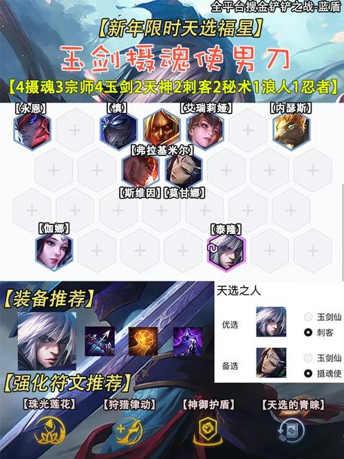 优先装备卡特,推荐英雄包括塔姆、卡特、蔚等。建议八人口锁血升9,找五费天选追三。宗师秘术玉剑仙阵容:优先装备男刀,推荐英雄包括男刀、莫甘娜、刀妹等。前期可用天选玉剑仙和决斗大师的天选过渡。在玩游戏时,记得根据实际情况灵活调整阵容和装备,以保持最大化输出和生存能力。