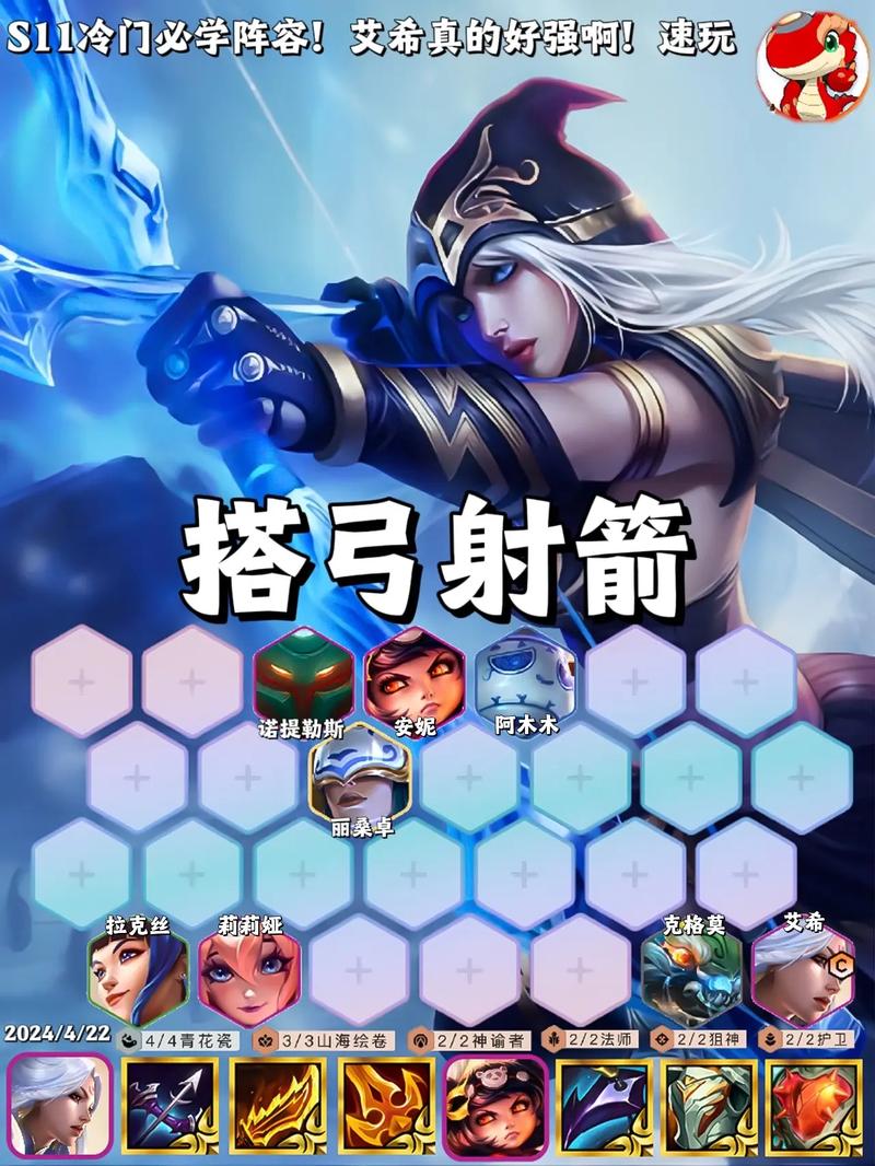 〖Four〗、金铲铲之战s5艾希主c阵容攻略配置:艾希+莫甘娜+德莱厄斯+婕拉+布隆+烬+奥利安娜+希尔科运营:前期尽量连胜打法。一般2-1开4,2-4升5,3-2升6人口。如果有质量可以提前开5打连胜压制。