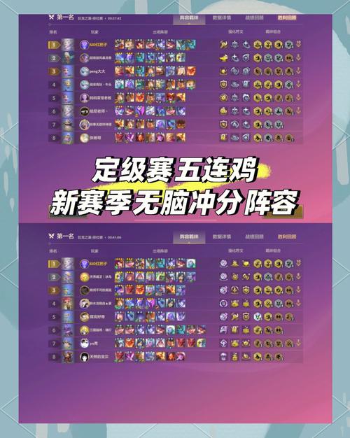 **阵容组成**:永恩、皎月、肾、阿卡丽、劫、凯南、派克、男刀、卡特。 **阵容强度**:成型后稳定得分,全员高质量有机会夺冠。 **核心装备**:火炮、蓝霸符、鸟盾等。 **运营思路**:- 以大剑开局,选取连败。- 优先合成阿卡丽和鸟盾装备。