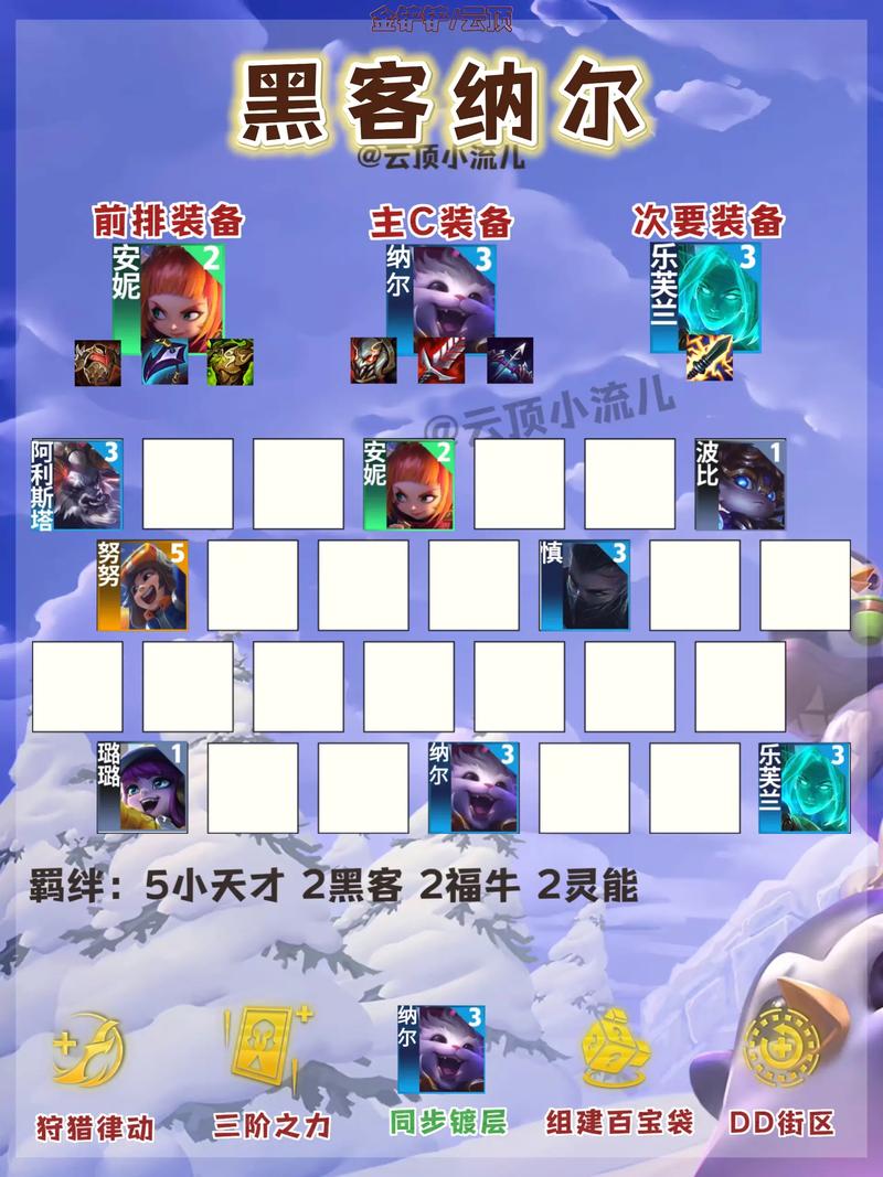 〖Two〗、金铲铲之战s5天才黑客纳尔阵容攻略如下:阵容搭配 阵容组成:波比、安妮、努努、派克、纳尔、慎、露露、人马。 羁绊组成:5小天才、3黑客、2护卫、2灵能使。装备推荐 纳尔:首选饮血剑、泰坦、轻语,次选无尽。这些装备可以提供纳尔所需的攻击力、吸血能力和穿甲效果。