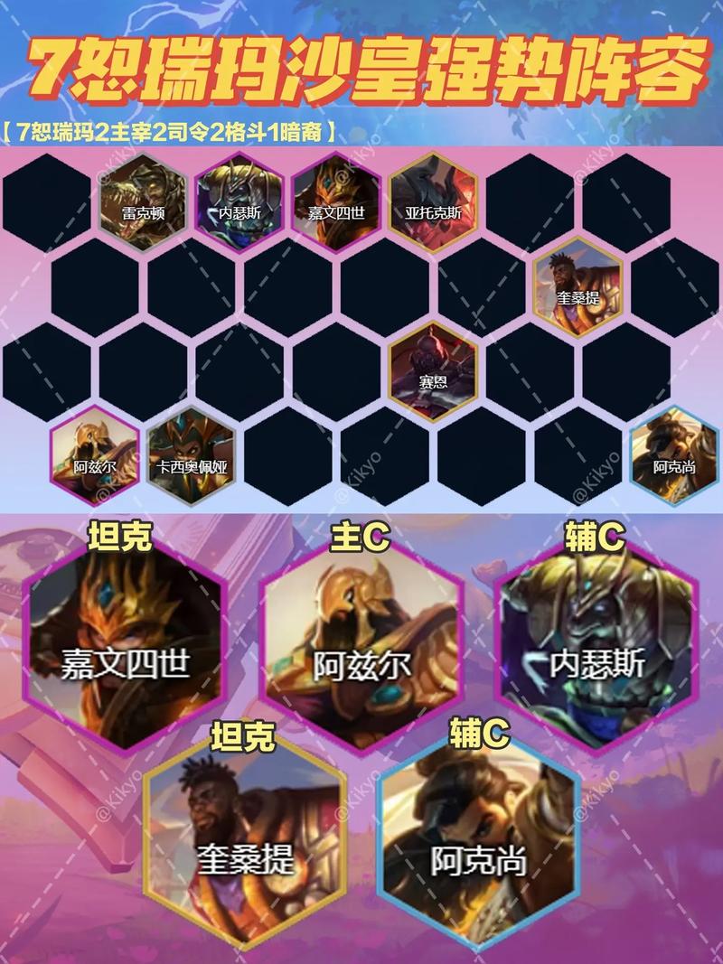 〖Two〗、海牛时代,S9老阵容恕瑞玛沙皇再次闪耀。随着121版本更新,游戏进入海牛时代,开局拿恕瑞玛转的机会大增。阵容核心恕瑞玛转可合成,有高概率开出九恕瑞玛,进一步提升上限。沙皇和狗头作为主C与主T,在近几个版本中得到了强化,只要成型,吃分能力极强。以下是具体玩法和阵容介绍。