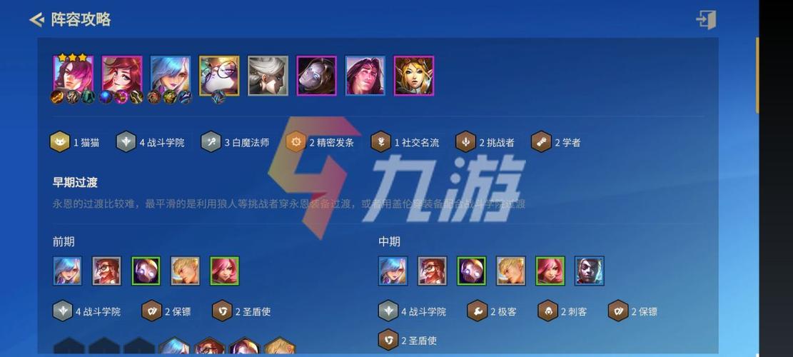 〖Two〗、游侠阵容拥有多种搭配方式,我推荐一种配置。英雄选取包括齐天大圣、日女、不屈战神、剑姬、驱邪圣枪、薇恩、驭影双生、圣光战神等。这些英雄的主要站位如下图所示:核心英雄的装备配置如下图:这种搭配方式较为容易实现,但在五人口时应利用利息将薇恩刷至三星,或者在升级人口时确保距离三星只差一件装备。