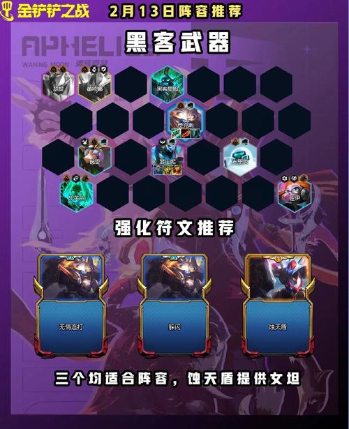 在《金铲铲之战》双城之战模式中,有几种阵容被认为是当前版本最强的,具体如下:阵容一:圣盾大嘴大嘴作为核心输出角色,推荐装备为羊刀、巨杀和水银。羊刀和巨杀是必备装备,以提高其输出能力。盖伦作为副C角色,不仅能充当前排坦克,还能在残局时进行收割。装备建议以肉装和回复装为主。