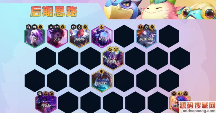 《金铲铲之战》s8版本上分阵容“爱心灵能使”玩法思路如下:阵容组成 安妮、乐芙兰、努努和威朗普、索拉卡、迦娜、娑娜、阿利斯塔、悠米、璐璐。阵容站位 安妮作为主C和主坦,应站在前排,通过叠加法强提升护盾值和恢复量。 后排乐芙兰负责补充输出,后期上9人口后补强高费卡。