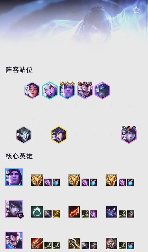 剑魔、艾瑞莉娅(刀妹)、亚索、瑞文、德莱文、天使、芮尔、武器大师、泰坦、拉克丝(璐璐或格温)其中6征服者是不变的,如果敌人是物理输出,剩下三个人口用3铁甲,如果敌人是魔法伤害,就把泰坦和武器大师换成2秘术。