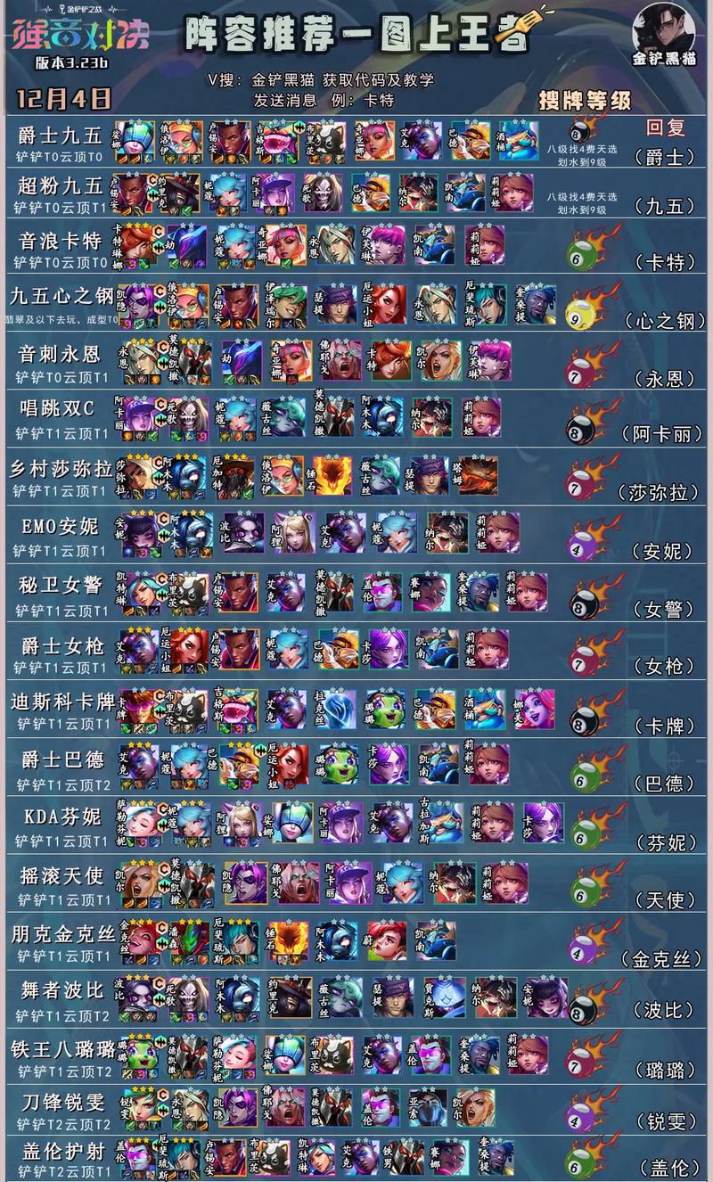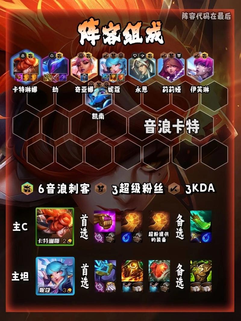 〖Three〗、金铲铲之战“音浪卡特”阵容推荐如下:阵容组成: 核心英雄:卡特琳娜 其他成员:劫、妮蔻、奇亚娜、永恩、伊芙琳、凯南、莉莉娅 羁绊搭配: 6音浪刺客:提升刺客们的攻击速度和暴击伤害。 3KDA:提供额外的攻击力和法术强度。 3超级粉丝:为友军提供治疗效果。 2真实伤害:造成无视护甲和魔抗的真实伤害。