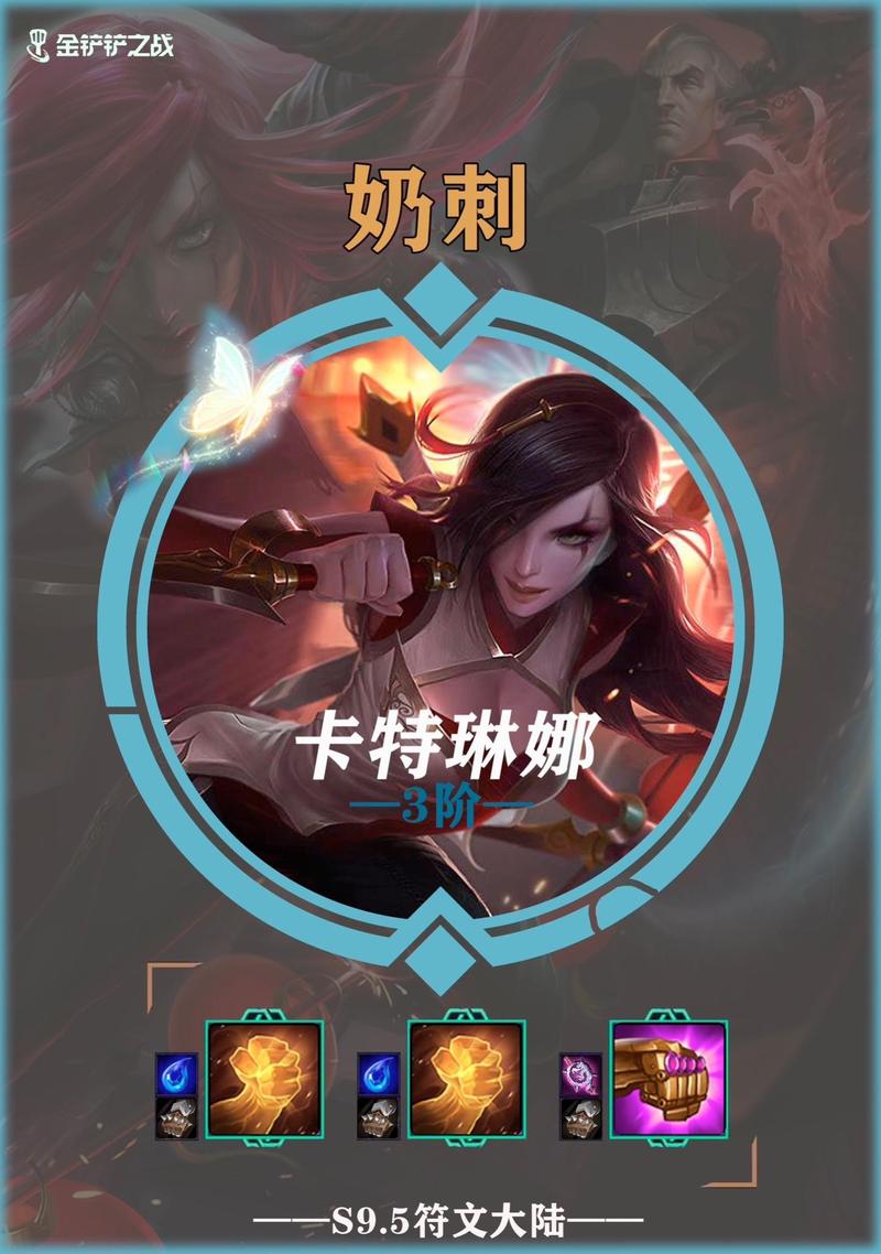 〖Two〗、卡特琳娜、劫、妮蔻、奇亚娜、永恩、伊芙琳、凯南、莉莉娅。羁绊组成:6音浪刺客、3KDA、3超级粉丝、2真实伤害、2护卫。赛季之星:卡特琳娜-音浪刺客。符文强化:理想配置为2个正义之手,通过顶级提升组建大军,7回合给2个小妮蔻,帮助快速达到3星。装备自助餐可以在石头人结束后,让卡特神装。