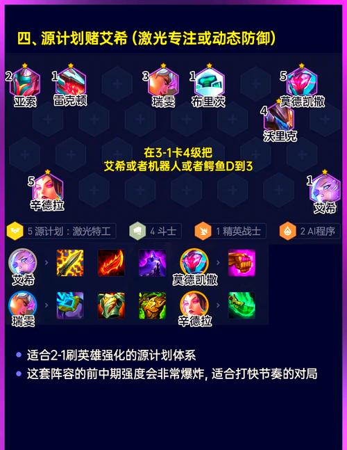 〖Five〗、适合新手的上分阵容 我们将介绍几种适合新手的基础阵容,这些阵容容易上手,且在当前版本的游戏环境中表现良好。阵容1:战士冠军阵容 核心英雄:盖伦、德莱厄斯、赛恩 推荐羁绊:战士、护卫 这个阵容以战士为主力,搭配几位护卫英雄增强防御。战士英雄通常拥有较高的生存能力和伤害输出,非常适合新手操作。