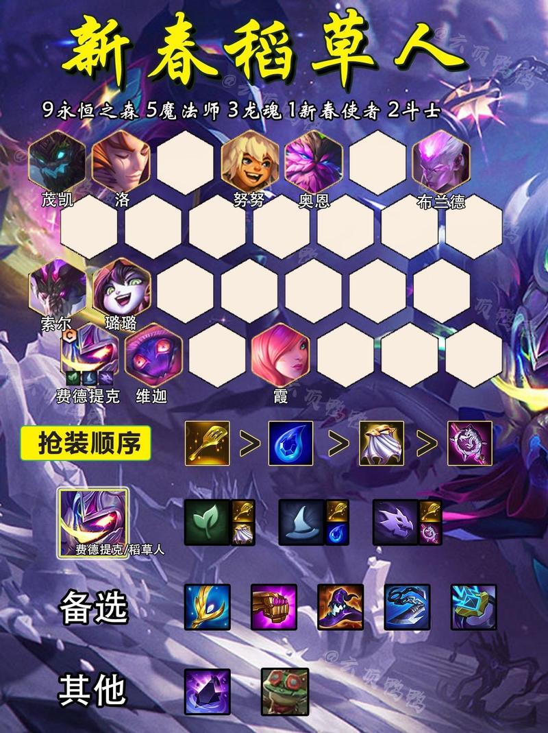 例如,稻草人阵容可能包含亚托克斯、卑尔维斯、稻草人、厄加特、莫德凯撒、索尔、莫甘娜、拉莫斯等英雄,这将影响稻草人的装备选取。每种阵容都有其独特的优势和劣势,因此,装备的选取应当适应阵容的整体战术。