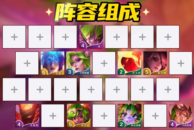 卡特琳娜、劫、妮蔻、奇亚娜、永恩、伊芙琳、凯南、莉莉娅。羁绊组成:6音浪刺客、3KDA、3超级粉丝、2真实伤害、2护卫。赛季之星:卡特琳娜-音浪刺客。符文强化:理想配置为2个正义之手,通过顶级提升组建大军,7回合给2个小妮蔻,帮助快速达到3星。装备自助餐可以在石头人结束后,让卡特神装。