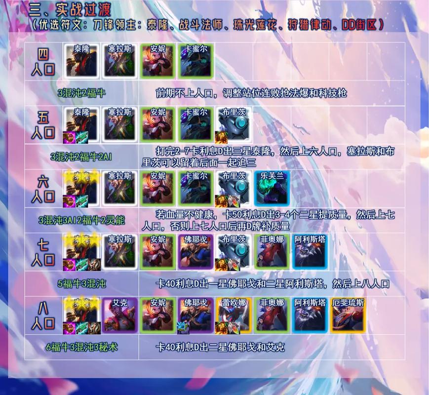 〖One〗、阶段:3-2升6人口,优先补充2刺客+2射手+2布卢姆,同时小搜确保二星图奇和二星后卫,稳定阵容质量。后续搜索三星图奇和三星绽放。4阶段:7人口,优先补维鲁斯,开三个快射手,如果未搜到三星布隆且有布隆同行,可准备补艾达丝。5阶段:8人口,布夏开四速射手,搜索三星戴安娜和三星维鲁斯。